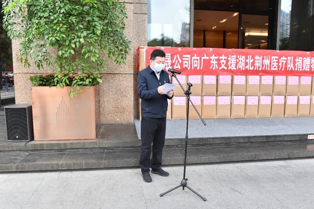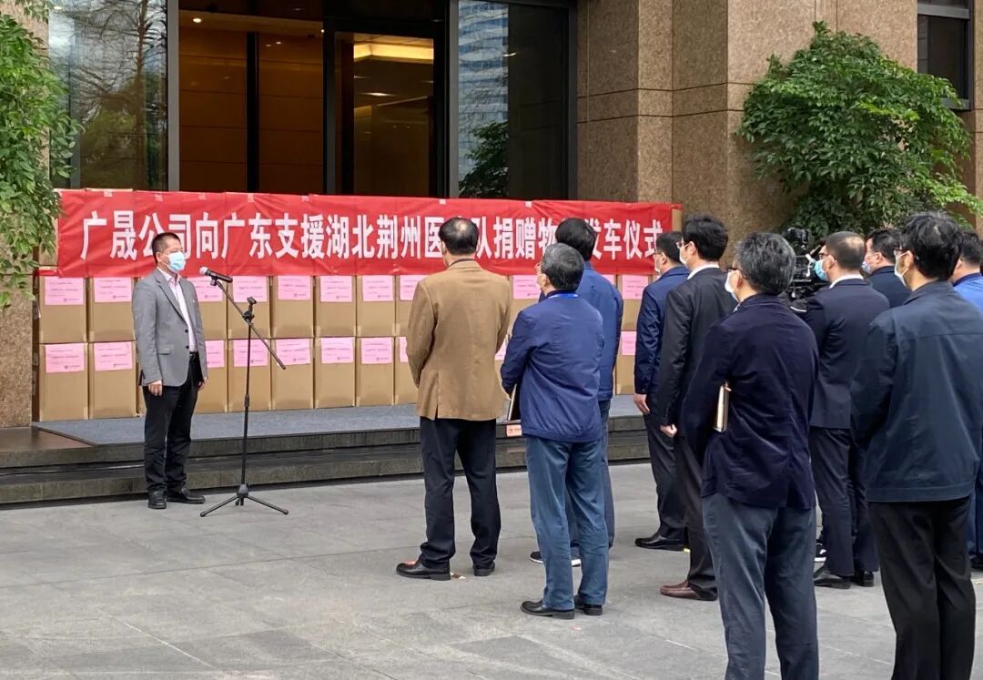 为深入贯彻习近平总书记就关心爱护参与疫情防控工作的医务人员作出的重要指示精神,认真落实省委省政府关于坚决完成好支援湖北荆州政治任务的工作部署,广晟公司向广东支援湖北荆州医疗队捐赠价值近200万元的生活物资。3月6日上午,广晟公司举行捐赠物资发车仪式。省国资委二级巡视员谭灿出席仪式并讲话,党委副书记、董事、总经理陈胜光等公司领导、省审计厅派驻公司审计专员出席仪式,党委副书记、董事、工会主席王绍乐作讲话,仪式由公司党委委员、副总经理刘伟主持。
