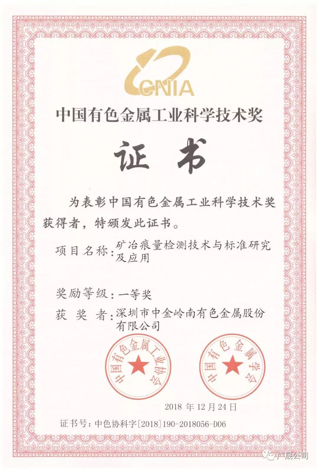 经中国有色金属工业协会、中国有色金属学会评审,由深圳市中金岭南有色金属股份有限公司参与制定、韶关冶炼厂负责完成的《矿冶痕量检测技术与标准研究及应用》《锌精矿焙砂化学分析方法》两个项目分别获得2018年中国有色金属工业科学技术一、二等奖。
