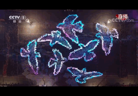 3000多名联欢群众演员跟着音乐的旋律,流动着拼组出“巍峨的长城”“飘曳的风筝”“展翅的和平鸽”“飘动的五星红旗”等令人叹为观止的主题巨幅动图,象征着全国人民携手共筑中国梦的美好寓意。